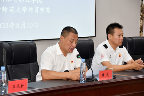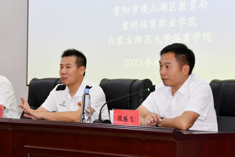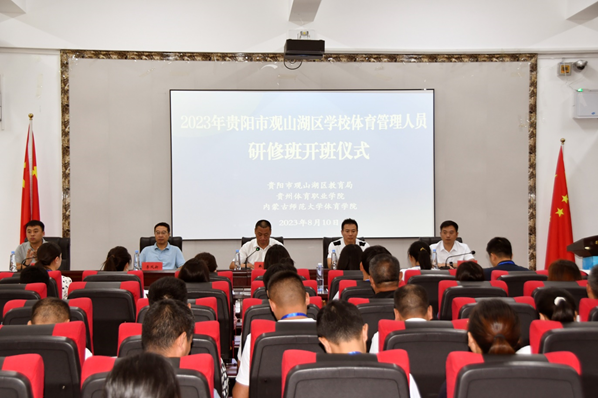 8月9日上午,2023年贵阳市观山湖区学校体育管理人员研修班在华体会网页版正式开班。华体会网页版党委书记韩武,体育学院党委副书记、副院长敖永胜,体育学院副院长李凤新,贵阳市观山湖区青少年艺术教育中心主任段练飞参加了开班仪式。开班仪式由贵阳市观山湖区教育局团委书记崔鹏主持。