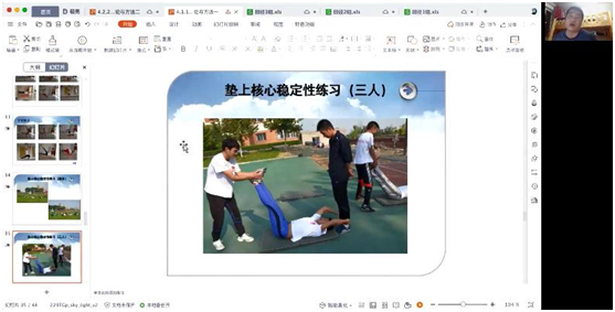 体操教研室的刘楠老师将教研室的《体操普修》《花样跳绳》等课程集中进行了介绍。通过微信群进行教学的组织,以学习通和好大学在线为主要授课平台,腾讯会议和微信为辅助平台。进一步开发了学习通的教学管理功能,在好大学在线上提前将教师录制的动作视频导入并安排学生进行学习,同时在直播中进行实时讲授,使教学过程更加直观。